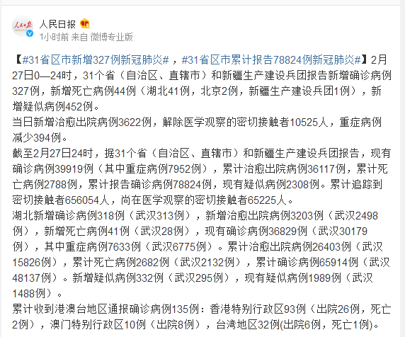 截至2月27日24时,据31个省(自治区、直辖市)和新疆生产建设兵团报告,现有确诊病例39919例(其中重症病例7952例),累计治愈出院病例36117例,累计死亡病例2788例,累计报告确诊病例78824例,现有疑似病例2308例。累计追踪到密切接触者656054人,尚在医学观察的密切接触者65225人。