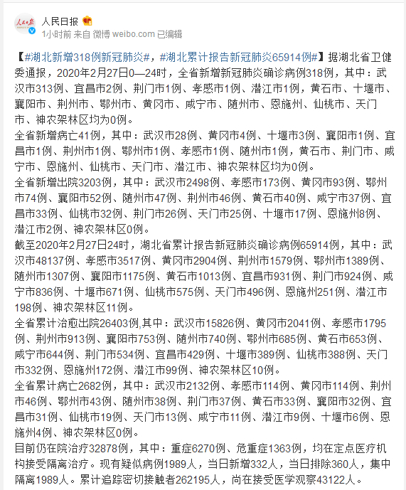 据湖北省卫健委通报,2020年2月27日0—24时,全省新增新冠肺炎确诊病例318例,其中:武汉市313例、宜昌市2例、荆门市1例、孝感市1例、潜江市1例,黄石市、十堰市、襄阳市、荆州市、鄂州市、黄冈市、咸宁市、随州市、恩施州、仙桃市、天门市、神农架林区均为0例。