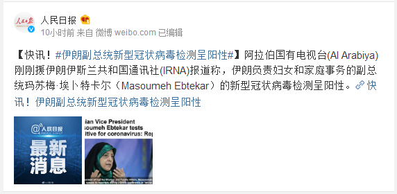 阿拉伯国有电视台(Al Arabiya)刚刚援伊朗伊斯兰共和国通讯社(IRNA)报道称,伊朗负责妇女和家庭事务的副总统玛苏梅·埃卜特卡尔(Masoumeh Ebtekar)的新型冠状病毒检测呈阳性。