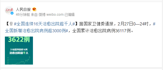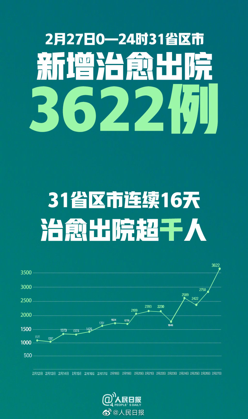 据国家卫健委通报,2月27日0—24时,#全国新增治愈出院病例超3000例#,全国累计治愈出院病例36117例。