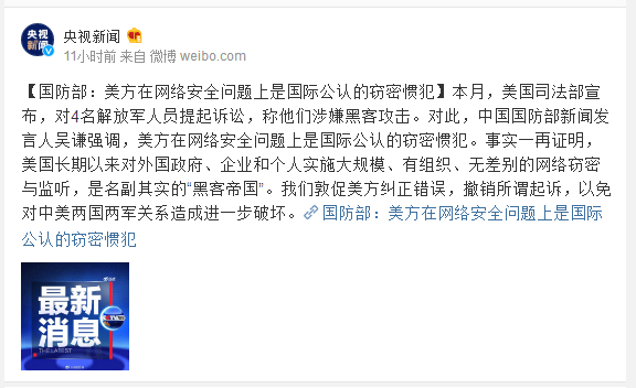 本月,美国司法部宣布,对4名解放军人员提起诉讼,称他们涉嫌黑客攻击。对此,中国国防部新闻发言人吴谦强调,美方在网络安全问题上是国际公认的窃密惯犯。事实一再证明,美国长期以来对外国政府、企业和个人实施大规模、有组织、无差别的网络窃密与监听,是名副其实的“黑客帝国”。我们敦促美方纠正错误,撤销所谓起诉,以免对中美两国两军关系造成进一步破坏。