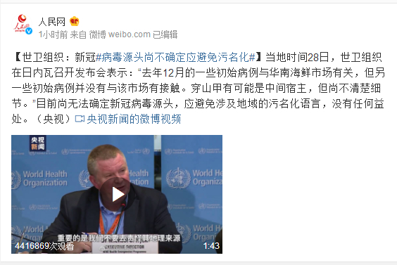 当地时间28日,世卫组织在日内瓦召开发布会表示:“去年12月的一些初始病例与华南海鲜市场有关,但另一些初始病例并没有与该市场有接触。穿山甲有可能是中间宿主,但尚不清楚细节。”目前尚无法确定新冠病毒源头,应避免涉及地域的污名化语言,没有任何益处。(央视)