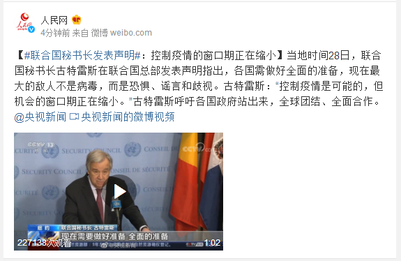 当地时间28日,联合国秘书长古特雷斯在联合国总部发表声明指出,各国需做好全面的准备,现在最大的敌人不是病毒,而是恐惧、谣言和歧视。古特雷斯:“控制疫情是可能的,但机会的窗口期正在缩小。”古特雷斯呼吁各国政府站出来,全球团结、全面合作。