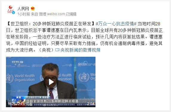 #万众一心抗击疫情# 当地时间28日,世卫组织总干事谭德塞在日内瓦表示,目前全球共有20多种新冠肺炎疫苗正在研发阶段,一些治疗方法正进行临床试验,预计几周内将获首批结果。谭德塞说,中国的经验证明,只要尽早采取有力措施,仍有机会遏制病毒传播,避免其成为大流行病。(央视)