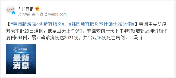截至29日9时韩国新增594例新冠肺炎 韩国新冠肺炎累计确诊2931例