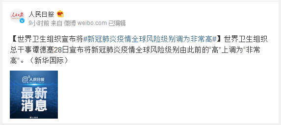 世界卫生组织宣布将新冠肺炎疫情全球风险级别调为非常高