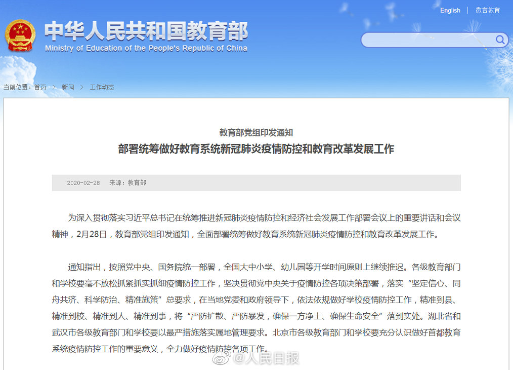 28日,教育部党组印发通知,全面部署统筹做好教育系统新冠肺炎疫情防控和教育改革发展工作。通知指出,全国大中小学、幼儿园等开学时间原则上继续推迟。不能搞“一刀切”、要求所有教师都制作直播课、所有学生每天上网“打卡”。