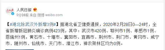 据湖北省卫健委通报,2020年2月28日0—24时,全省新增新冠肺炎确诊病例423例,其中:武汉市420例、鄂州市1例、孝感市1例、恩施州1例,黄石市、十堰市、襄阳市、宜昌市、荆州市、荆门市、黄冈市、咸宁市、随州市、仙桃市、天门市、潜江市、神农架林区均为0例。