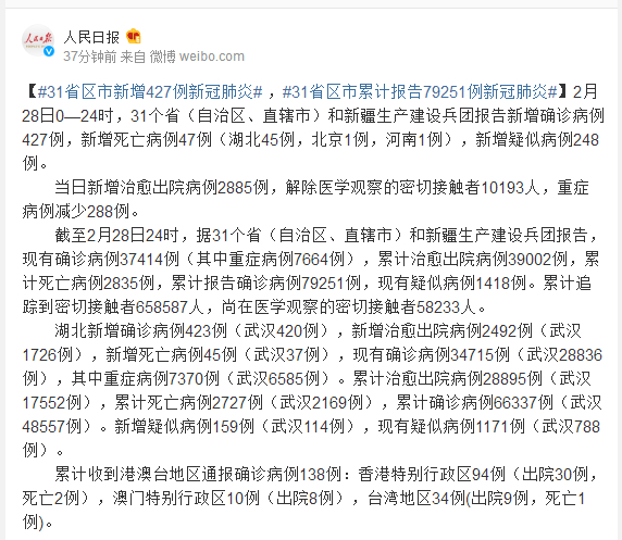 截至2月28日24时,据31个省(自治区、直辖市)和新疆生产建设兵团报告,现有确诊病例37414例(其中重症病例7664例),累计治愈出院病例39002例,累计死亡病例2835例,累计报告确诊病例79251例,现有疑似病例1418例。累计追踪到密切接触者658587人,尚在医学观察的密切接触者58233人。