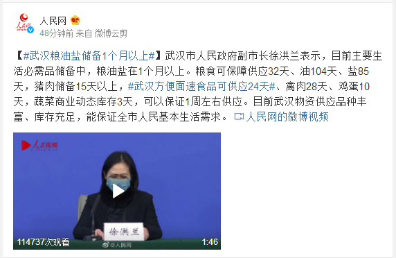 武汉市人民政府副市长徐洪兰表示,目前主要生活必需品储备中,粮油盐在1个月以上。粮食可保障供应32天、油104天、盐85天,猪肉储备15天以上,#武汉方便面速食品可供应24天#、禽肉28天、鸡蛋10天,蔬菜商业动态库存3天,可以保证1周左右供应。目前武汉物资供应品种丰富、库存充足,能保证全市人民基本生活需求。