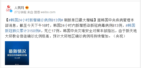 据韩国中央疾病管理本部消息,截至今天下午16时,韩国24小时内新增感染新冠病毒病例813例,#韩国新冠肺炎累计3150例#,死亡17例。韩国中央灾难安全对策本部指出,由于新天地大邱教会信徒确诊比例极高,预计大邱地区确诊病例将持续增加。(央视)