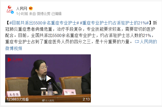 新冠肺炎重症患者病情危重,治疗手段复杂,专业技能要求较高,需要密切的医护配合。目前,全国共派出5500余名重症专业护士,约占派驻护士总人数的21%,重症专业护士占到了重症医务人员的四分之三,是十分重要的力量。