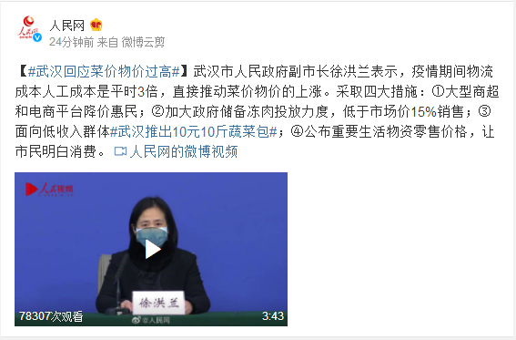 武汉市人民政府副市长徐洪兰表示,疫情期间物流成本人工成本是平时3倍,直接推动菜价物价的上涨。采取四大措施:①大型商超和电商平台降价惠民;②加大政府储备冻肉投放力度,低于市场价15%销售;③面向低收入群体#武汉推出10元10斤蔬菜包#;④公布重要生活物资零售价格,让市民明白消费。