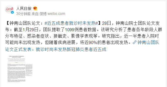28日,钟南山院士团队论文发布:截至1月29日,团队提取了1099例患者数据。该研究分析了患者各年龄段人群分布特征、感染者症状、接触史、影像学表现等。研究指出,近一半患者入院时可能尚未出现发热,但随着疾病进展,将近90%的患者出现发热。钟南山团队论文正式发表:就诊时尚未发热新冠肺炎患者近五成