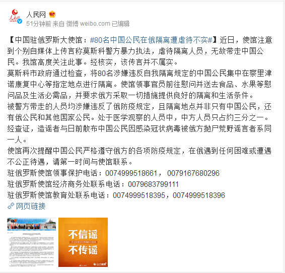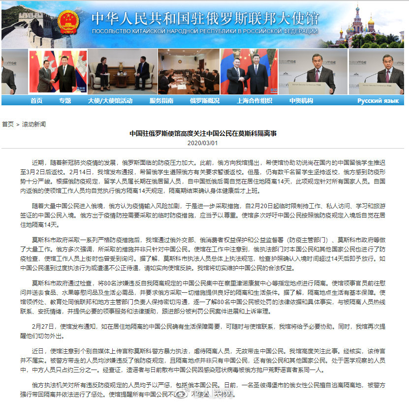 近日,使馆注意到个别自媒体上传言称莫斯科警方暴力执法,虐待隔离人员,无故带走中国公民。我馆高度关注此事。经核实,该传言并不属实。