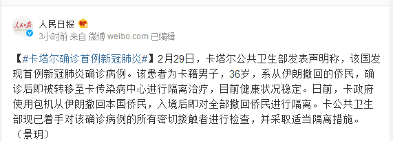 2月29日,卡塔尔公共卫生部发表声明称,该国发现首例新冠肺炎确诊病例。该患者为卡籍男子,36岁,系从伊朗撤回的侨民,确诊后即被转移至卡传染病中心进行隔离治疗,目前健康状况稳定。日前,卡政府使用包机从伊朗撤回本国侨民,入境后即对全部撤回侨民进行隔离。卡公共卫生部现已着手对该确诊病例的所有密切接触者进行检查,并采取适当隔离措施。(景玥)