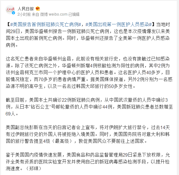 当地时间29日,美国华盛顿州报告一例新冠肺炎死亡病例,这也是本次疫情爆发以来美国本土出现的首例死亡病例。同时,华盛顿州还报告了全美第一例医护人员感染病例。