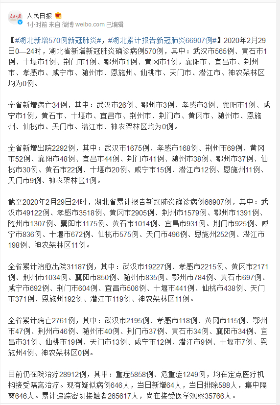 截至2020年2月29日24时,湖北省累计报告新冠肺炎确诊病例66907例,其中:武汉市49122例、孝感市3518例、黄冈市2905例、荆州市1579例、鄂州市1391例、随州市1307例、襄阳市1175例、黄石市1014例、宜昌市931例、荆门市925例、咸宁市836例、十堰市672例、仙桃市575例、天门市496例、恩施州252例、潜江市198例、神农架林区11例。