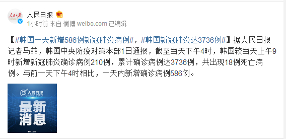 据人民日报记者马菲,韩国中央防疫对策本部1日通报,截至当天下午4时,韩国较当天上午9时新增新冠肺炎确诊病例210例,累计确诊病例达3736例,共出现18例死亡病例。与前一天下午4时相比,一天内新增确诊病例586例。