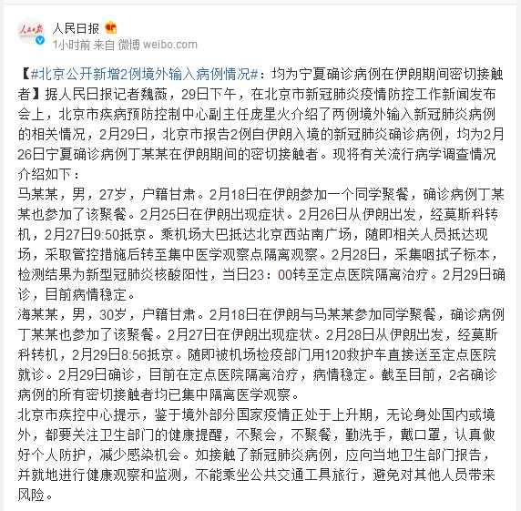 据人民日报记者魏薇,29日下午,在北京市新冠肺炎疫情防控工作新闻发布会上,北京市疾病预防控制中心副主任庞星火介绍了两例境外输入新冠肺炎病例的相关情况,2月29日,北京市报告2例自伊朗入境的新冠肺炎确诊病例,均为2月26日宁夏确诊病例丁某某在伊朗期间的密切接触者。现将有关流行病学调查情况介绍如下: