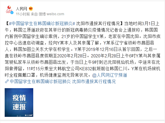 当地时间3月1日上午,韩国江原道政府在其举行的新冠病毒肺炎疫情情况记者会上通报称,韩国国内首例中国留学生确诊案例,21岁的中国留学生Y某,老家在中国沈阳。沈阳市疾控中心迅速启动调查,经向Y某本人及其亲属了解,Y某系辽宁省铁岭市昌图县人,韩国加图立关东大学在校学生。Y某于2019年12月16日从首尔回国,之后一直在铁岭市昌图县度假期至2020年2月28日。2020年2月28日上午6时Y某与其亲属驾驶私家车从铁岭市昌图县出发,于当日上午9时到达沈阳桃仙机场,中途未在沈阳做停留,11时15分乘坐大韩航空公司KE832航班前往韩国仁川。Y某在机场候机时全程佩戴口罩,机场健康监测无异常状况。