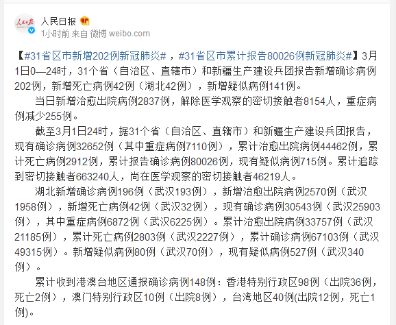 3月1日0—24时,31个省(自治区、直辖市)和新疆生产建设兵团报告新增确诊病例202例,新增死亡病例42例(湖北42例),新增疑似病例141例。