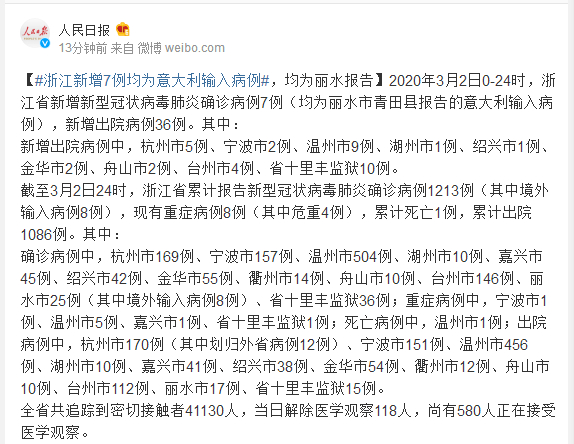 2020年3月2日0-24时,浙江省新增新型冠状病毒肺炎确诊病例7例(均为丽水市青田县报告的意大利输入病例),新增出院病例36例。其中: