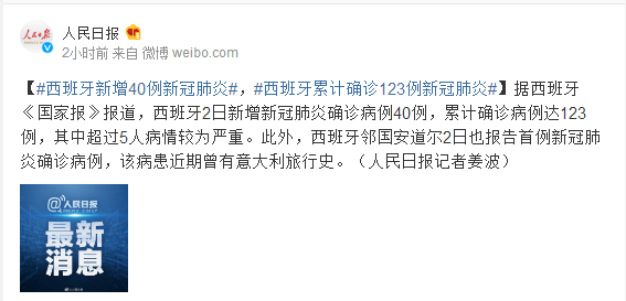 据西班牙《国家报》报道,西班牙2日新增新冠肺炎确诊病例40例,累计确诊病例达123例,其中超过5人病情较为严重。此外,西班牙邻国安道尔2日也报告首例新冠肺炎确诊病例,该病患近期曾有意大利旅行史。(人民日报记者姜波)