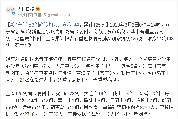 2020年3月2日0时至24时,辽宁省新增3例新型冠状病毒肺炎确诊病例,均为丹东市病例,其中普通型病例2例、轻型病例1例。全省累计报告新型冠状病毒肺炎确诊病例125例,治愈出院103例,死亡1例。