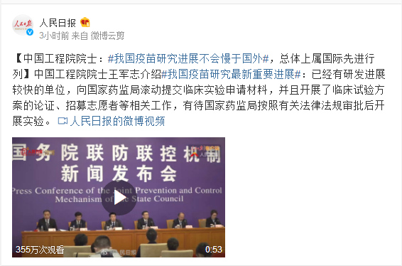中国工程院院士王军志介绍#我国疫苗研究最新重要进展#:已经有研发进展较快的单位,向国家药监局滚动提交临床实验申请材料,并且开展了临床试验方案的论证、招募志愿者等相关工作,有待国家药监局按照有关法律法规审批后开展实验。