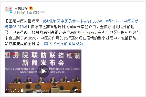 国家中医药管理局科技司司长李昱介绍,全国除湖北以外的地区,中医药参与救治的病例占累计确诊病例的96.37%,在湖北地区中医药的参与率也达到了91.05%。中医药作用的发挥还体现在疫情的整个过程中,包括预防、治疗和康复的全过程。