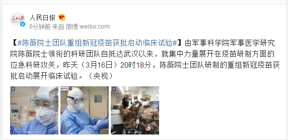 由军事科学院军事医学研究院陈薇院士领衔的科研团队自抵达武汉以来,就集中力量展开在疫苗研制方面的应急科研攻关,昨天(3月16日)20时18分,陈薇院士团队研制的重组新冠疫苗获批启动展开临床试验。(央视)