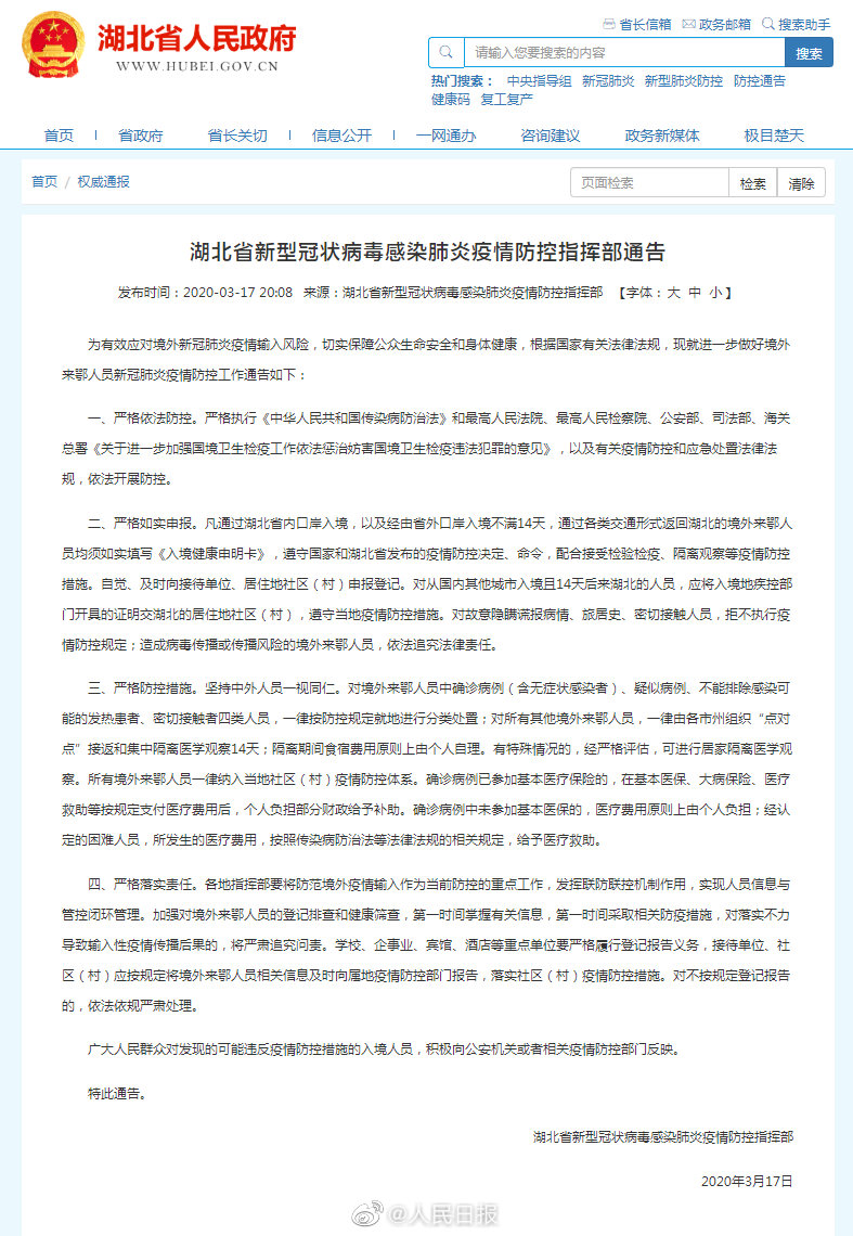 湖北省新型冠状病毒感染肺炎疫情防控指挥部发布通告,对境外来鄂人员中确诊病例(含无症状感染者)、疑似病例、不能排除感染可能的发热患者、密切接触者四类人员,一律按防控规定就地进行分类处置;对所有其他境外来鄂人员,一律由各市州组织“点对点”接返和集中隔离医学观察14天;隔离期间食宿费用原则上由个人自理。