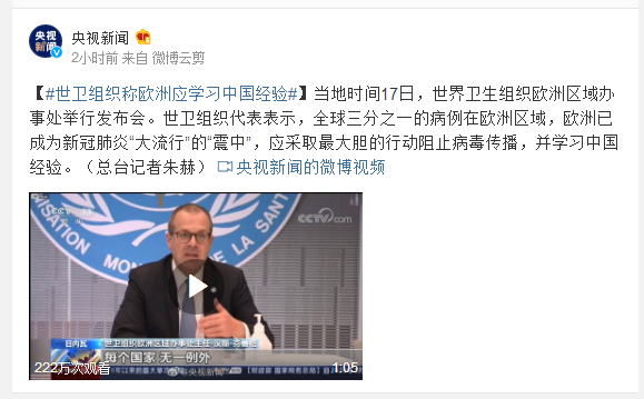 当地时间17日,世界卫生组织欧洲区域办事处举行发布会。世卫组织代表表示,全球三分之一的病例在欧洲区域,欧洲已成为新冠肺炎“大流行”的“震中”,应采取最大胆的行动阻止病毒传播,并学习中国经验。(总台记者朱赫)