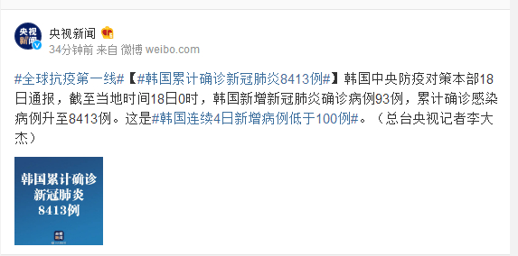 韩国中央防疫对策本部18日通报,截至当地时间18日0时,韩国新增新冠肺炎确诊病例93例,累计确诊感染病例升至8413例。这是#韩国连续4日新增病例低于100例#。(总台央视记者李大杰)