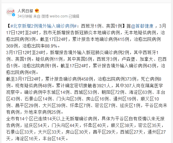 截至3月17日24时,累计报告确诊病例458例,治愈出院病例373例,死亡病例8例。现有疑似病例48例。累计确定密切接触者3921人,其中307人尚在隔离医学观察中。确诊病例中东城区14例、西城区53例、朝阳区72例、海淀区63例、丰台区43例、石景山区14例、门头沟区3例、房山区16例、通州区19例、顺义区10例、昌平区29例、大兴区39例、怀柔区7例、密云区7例、延庆区1例,平谷区尚未有病例,外地来京病例25例。