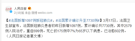3月17日,法国卫生部宣布,法国新冠肺炎患者较昨日新增1097例,累计确诊共7730例,其中2579例入院治疗,重症699例。死亡的175例中7%为65岁以下病患。已治愈602例。(人民日报记者葛文博)