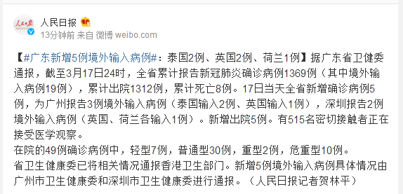 据广东省卫健委通报,截至3月17日24时,全省累计报告新冠肺炎确诊病例1369例(其中境外输入病例19例),累计出院1312例,累计死亡8例。17日当天全省新增确诊病例5例,为广州报告3例境外输入病例(泰国输入2例、英国输入1例),深圳报告2例境外输入病例(英国、荷兰各输入1例)。新增出院5例。有515名密切接触者正在接受医学观察。