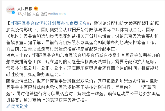 消息人士称:“国际奥委会和东京奥运会组委会仍然在按照东京奥运会如期举办的想法安排筹备工作。现在遇到的问题是资格赛无法举行,需要分配和扩大配额,使资格分配公开、公正、公平。现在距东京奥运会还有四个月的时间,相信能够战胜疫情,如期举办奥运会。”