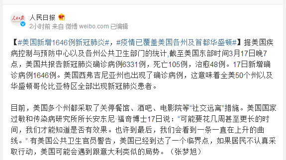 据美国疾病控制与预防中心以及各州公共卫生部门的统计,截至美国东部时间3月17日晚7点,美国共报告新冠肺炎确诊病例6331例,死亡105例,治愈48例。17日新增确诊病例1646例。美国西弗吉尼亚州也出现了确诊病例,这意味着全美50个州以及华盛顿哥伦比亚特区全部出现新冠肺炎患者。
