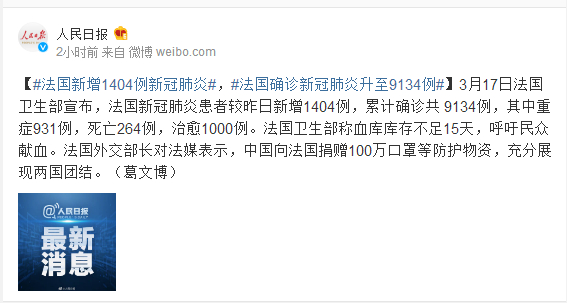 3月17日法国卫生部宣布,法国新冠肺炎患者较昨日新增1404例,累计确诊共 9134例,其中重症931例,死亡264例,治愈1000例。法国卫生部称血库库存不足15天,呼吁民众献血。法国外交部长对法媒表示,中国向法国捐赠100万口罩等防护物资,充分展现两国团结。(葛文博)