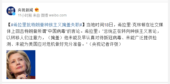 当地时间18日,希拉里·克林顿在社交媒体上回击特朗普所谓“中国病毒”的言论。希拉里:“总统正在转向种族主义言论,以转移人们注意力,(掩盖)他未能及早认真对待新冠病毒、未能广泛提供检测、未能为美国应对危机做好充分准备。”(央视记者许弢)