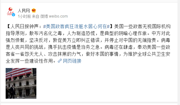 美国一些政客无视国际机构指导原则,散布污名化之毒,人为制造恐慌,是典型的阴暗心理作祟。中方对此强烈愤慨,坚决反对,敦促美方立即纠正错误,并停止对中国的无端指责。病毒是人类共同的挑战,携手抗击疫情是当务之急。病毒还在肆虐,奉劝美国一些政客省一省怨天尤人、攻击抹黑的力气,做好本国的事情,为维护全球公共卫生安全发挥一些建设性作用。