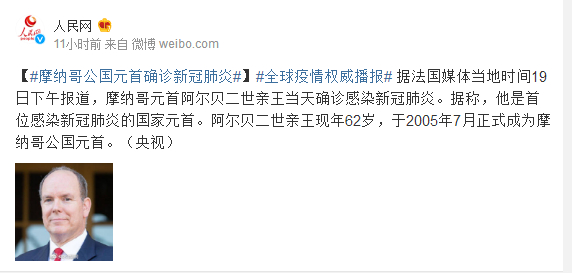 #全球疫情权威播报# 据法国媒体当地时间19日下午报道,摩纳哥元首阿尔贝二世亲王当天确诊感染新冠肺炎。据称,他是首位感染新冠肺炎的国家元首。阿尔贝二世亲王现年62岁,于2005年7月正式成为摩纳哥公国元首。(央视)