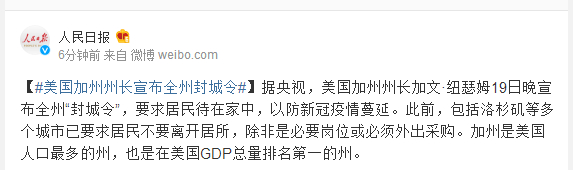 据央视,美国加州州长加文·纽瑟姆19日晚宣布全州“封城令”,要求居民待在家中,以防新冠疫情蔓延。此前,包括洛杉矶等多个城市已要求居民不要离开居所,除非是必要岗位或必须外出采购。加州是美国人口最多的州,也是在美国GDP总量排名第一的州。