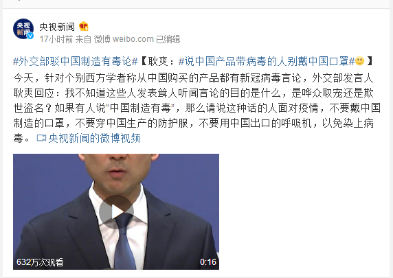 今天,针对个别西方学者称从中国购买的产品都有新冠病毒言论,外交部发言人耿爽回应:我不知道这些人发表耸人听闻言论的目的是什么,是哗众取宠还是欺世盗名?如果有人说“中国制造有毒”,那么请说这种话的人面对疫情,不要戴中国制造的口罩,不要穿中国生产的防护服,不要用中国出口的呼吸机,以免染上病毒。