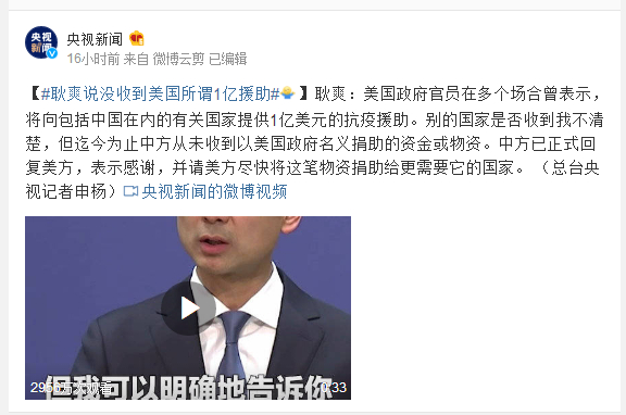 耿爽:美国政府官员在多个场合曾表示,将向包括中国在内的有关国家提供1亿美元的抗疫援助。别的国家是否收到我不清楚,但迄今为止中方从未收到以美国政府名义捐助的资金或物资。中方已正式回复美方,表示感谢,并请美方尽快将这笔物资捐助给更需要它的国家。 (总台央视记者申杨)