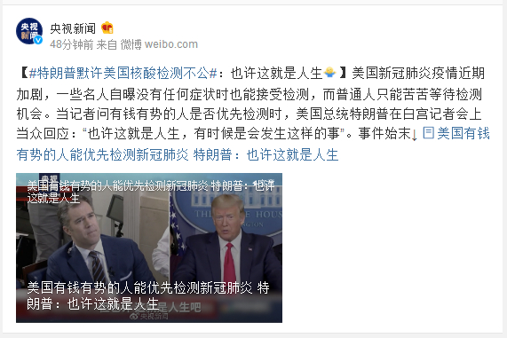 美国新冠肺炎疫情近期加剧,一些名人自曝没有任何症状时也能接受检测,而普通人只能苦苦等待检测机会。当记者问有钱有势的人是否优先检测时,美国总统特朗普在白宫记者会上当众回应:“也许这就是人生,有时候是会发生这样的事”。事件始末