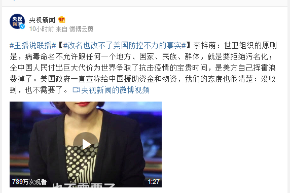 李梓萌:世卫组织的原则是,病毒命名不允许跟任何一个地方、国家、民族、群体,就是要拒绝污名化;全中国人民付出巨大代价为世界争取了抗击疫情的宝贵时间,是美方自己挥霍浪费掉了。美国政府一直宣称给中国援助资金和物资,我们的态度也很清楚:没收到,也不需要了。