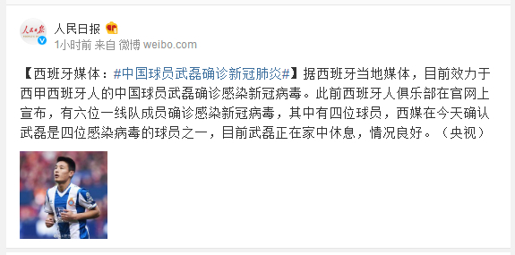 据西班牙当地媒体,目前效力于西甲西班牙人的中国球员武磊确诊感染新冠病毒。此前西班牙人俱乐部在官网上宣布,有六位一线队成员确诊感染新冠病毒,其中有四位球员,西媒在今天确认武磊是四位感染病毒的球员之一,目前武磊正在家中休息,情况良好。(央视)